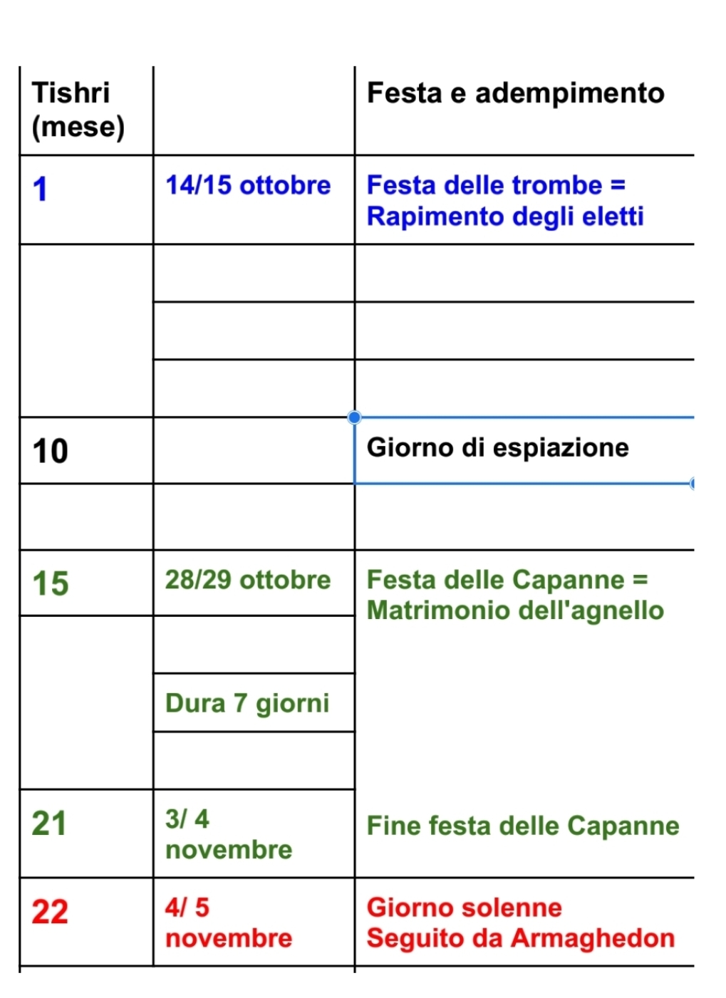 Questi ultimi tempi supplementari, per quanto riguarda il nostro caso sono una prerogativa di Dio. Nessuno di noi può conoscere con precisione la durata dei tempi supplementari, vale a dire il giorno e l’ora. Perciò il giorno 1 di questa tabella diventa il momento in cui gli eletti saranno rapiti in cielo. Quello segnerà il primo giorno del nostro conteggio di 22 giorni. Avere ben chiari in mente questa tabella, traslandola man mano che passano i giorni, sarà molto importante per coloro che hanno la speranza di vivere su una terra paradisiaca e che supereranno la tribolazione di 21 giorni, in quanto avranno sempre ben chiara nella mente l’inizio e la fine della futura tribolazione di 21 giorni. Mentre coloro che hanno la speranza di andare in cielo non ci saranno già più.