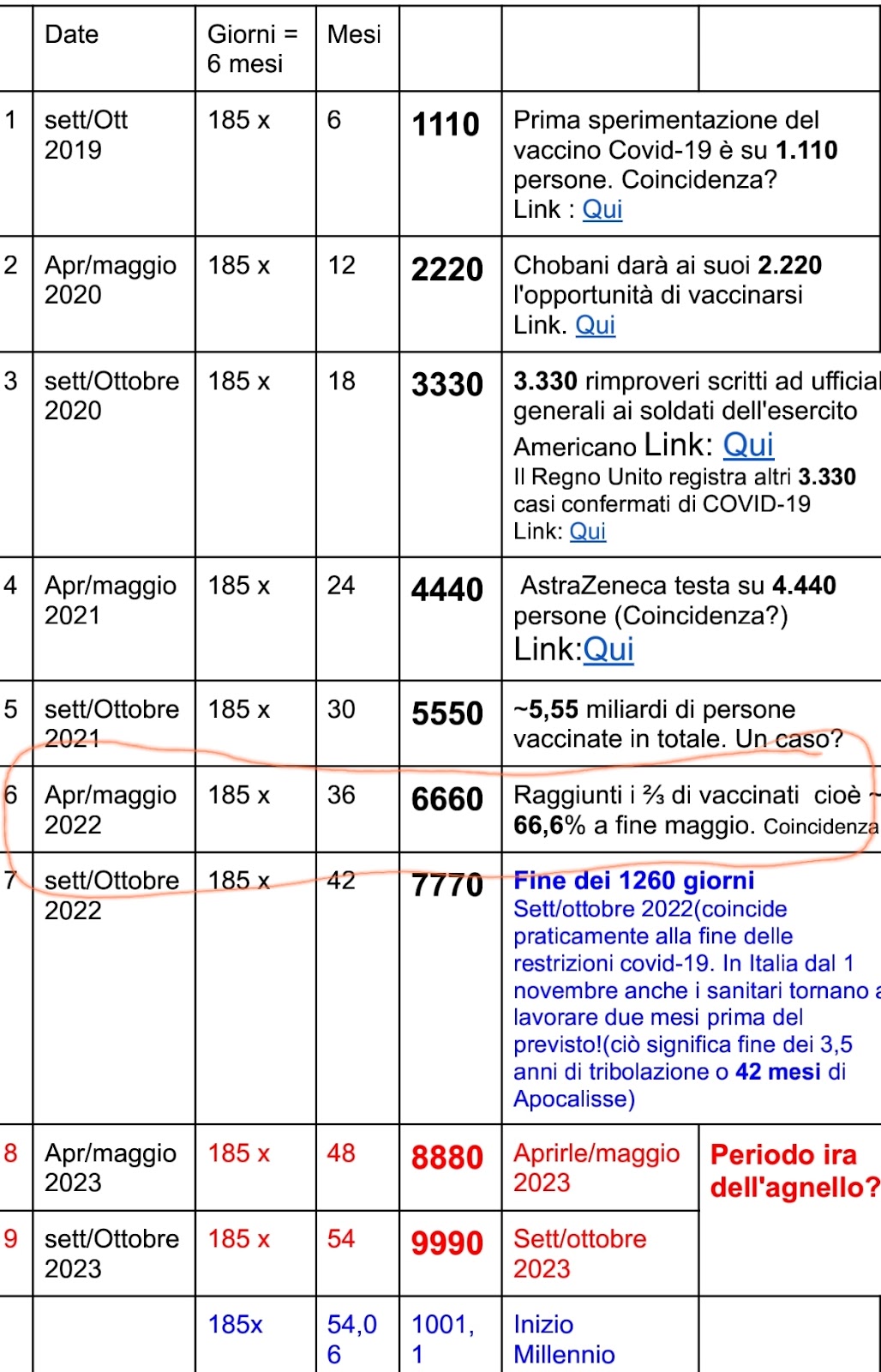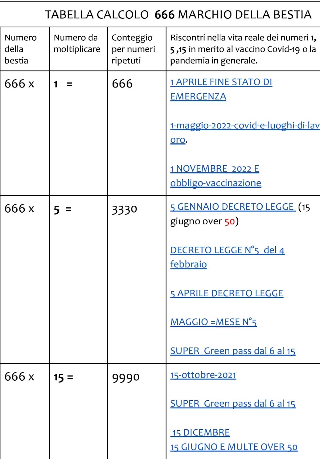 “Maneggiando” il numero 666 abbiamo cercato di trarre qualche conclusione in relazione all’imposizione del marchio della bestia. Prima di tutto ci è venuto in mente questo vecchio articolo che avevamo scritto, in cui era venuto fuori il numero 666 in relazione al vaccino Covid-19, che per noi rappresenta appunto il marchio biblico della bestia. Perciò, anche se il numero della bestia ci è già stato dato, si può partire da questo per definire le varie tappe relative all’imposizione del marchio. In relazione a questo, sono state ricavate due tabelle. Vediamole subito.