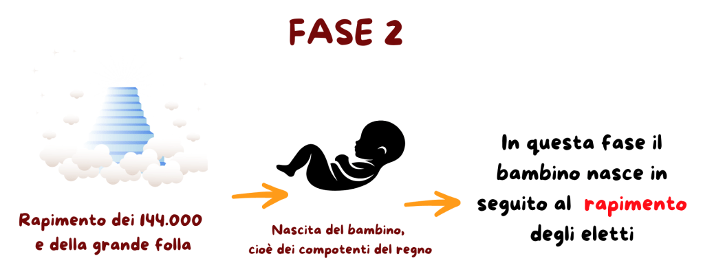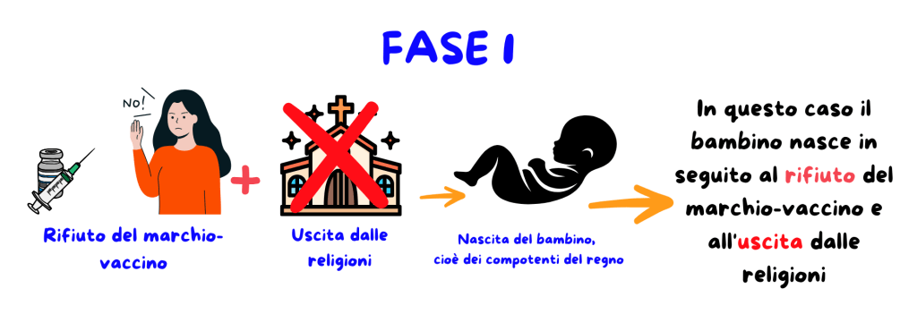 In questa prima fase, quindi, la nascita del bambino è una conseguenza del rifiuto, da parte degli eletti, del marchio-vaccino e dell’uscita da Babilonia la grande.