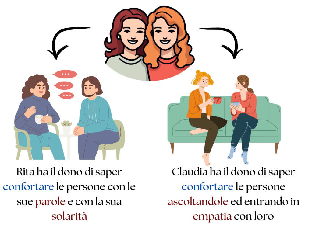Per comprendere appieno il concetto, consideriamo il seguente esempio. Rita e Claudia sono molto amiche; Rita è solare, espansiva e ha il dono di riuscire a parlare con tutti, trasmettendo gioia e allegria alle persone. Claudia, invece, è piuttosto silenziosa e ha il dono di saper ascoltare le persone, facendole sentire amate e capite. Entrambe conoscono il proprio dono e sono felici di averlo, perché sanno che è da Dio; allo stesso tempo, però, riconoscono la loro diversità, non considerandosi migliori l’una dell’altra, ma ammirandosi a vicenda e cercando di imparare quanto più possibile dalla rispettiva. Rita osserva come Claudia ascolta le persone e ammira il modo in cui, grazie alla sua empatia, riesce a confortarle. Allo stesso modo Claudia osserva Rita e rimane stupita da come lei riesca sempre a trovare le parole giuste, incoraggiando le persone con la sua allegria e solarità. Rita e Claudia mettono quindi in pratica le parole dell’apostolo Paolo. Facendo così, hanno la possibilità di imparare l’una dall’altra, non giudicando il loro modo di fare migliore. Rita, infatti, potrebbe pensare che, avendo la capacità di parlare bene, lei riesca ad incoraggiare meglio i fratelli e le sorelle. Non considerando che, a volte, le persone possono essere confortate con un solo sguardo. Viceversa Claudia potrebbe pensare che Rita parli troppo, non considerando che, in certe occasioni, sentir parlare un amico, può essere molto più utile che parlare.