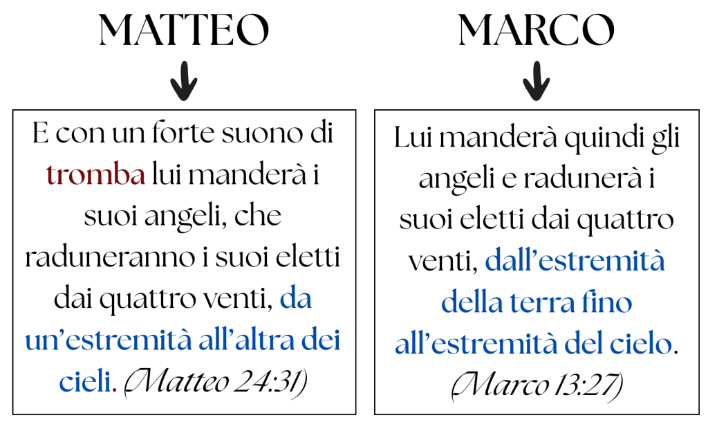2) In Marco il radunamento degli eletti avviene dall’estremità della terra fino all’estremità dei cieli, in Matteo viene menzionata solo l’estremità dei cieli.
