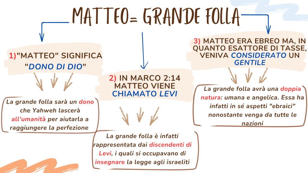 – Un primo aspetto che ci aiuta a capire che Matteo rappresenta la grande folla, è il modo in cui viene chiamato nei racconti paralleli. Sappiamo che il nome Matteo significa “dono di Dio”, ed infatti la grande folla, quando il regno sarà stabilito fermamente, sarà proprio un dono che Dio lascerà agli abitanti della terra, mentre Cristo porterà con sé i 144000.