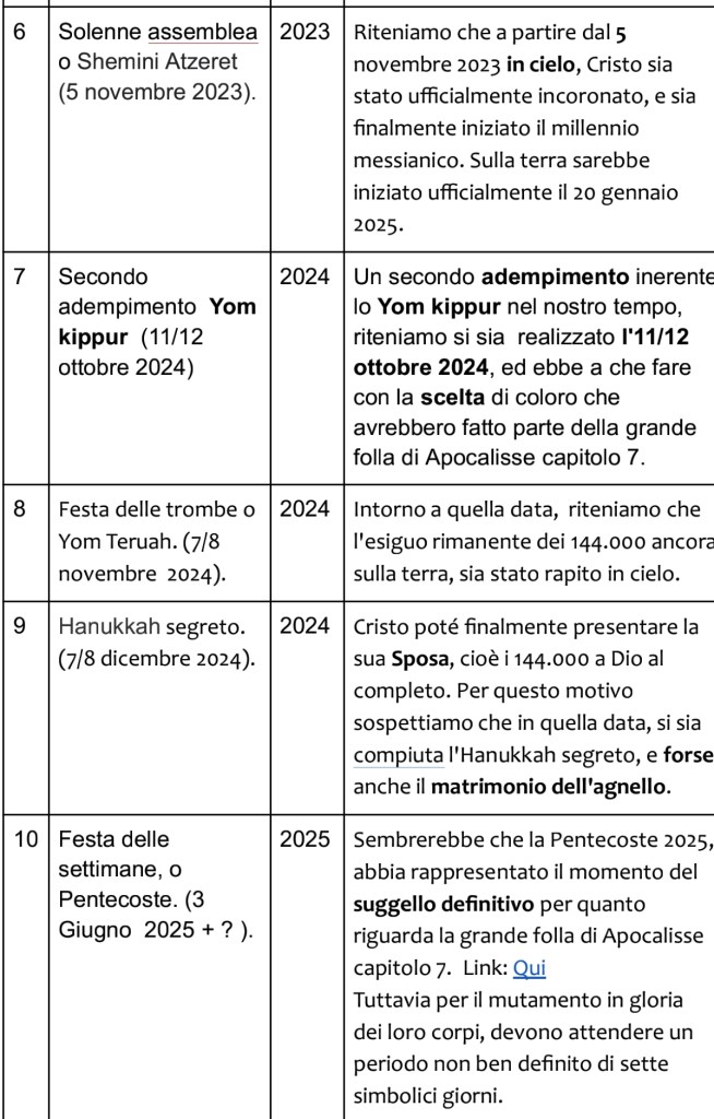 Noi riteniamo che questa festa profetica si sia adempiuta il 5 novembre 2023. Riteniamo che, in questa data, Cristo sia stato ufficialmente incoronato in cielo e sia finalmente iniziato il millennio messianico. Sulla terra ciò sarebbe avvenuto con circa un anno di ritardo, ovvero il 20 gennaio 2025.