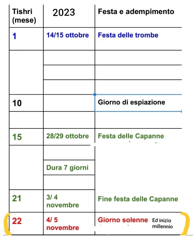 Quindi il 4/ 5 novembre 2023 corrispose all’ultimo giorno delle feste ebraiche dell’autunno, vale a dire il 22 Tishri, il giorno dell’assemblea solenne, sempre tenendo conto che, per essere in fase con il calendario divino, dobbiamo aggiungere 30 giorni al calendario ebraico di quell’anno; (Levitico 23: 34-36). Si tratta quindi di una degna conclusione di questo periodo profetico iniziato il 21/22 maggio 2019, in occasione della festa ebraica del covone e dei pani non fermentati. Inizia con una festa ebraica e finisce con un’altra festa ebraica, l’ultima in ordine!